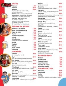 En cuanto a las bebidas, el menú ofrece una amplia variedad de opciones, desde cervezas y cócteles hasta bebidas sin alcohol. Esto es especialmente importante en un bar, donde la experiencia no solo se trata de la comida, sino también de la bebida. La sección de shoots y coctelería es particularmente destacable, ya que ofrece opciones creativas que pueden atraer a un público más joven y aventurero.