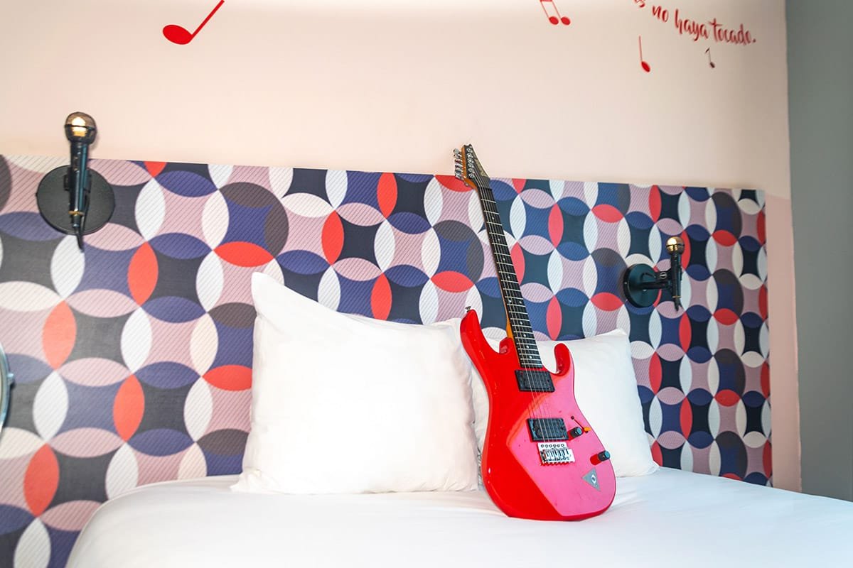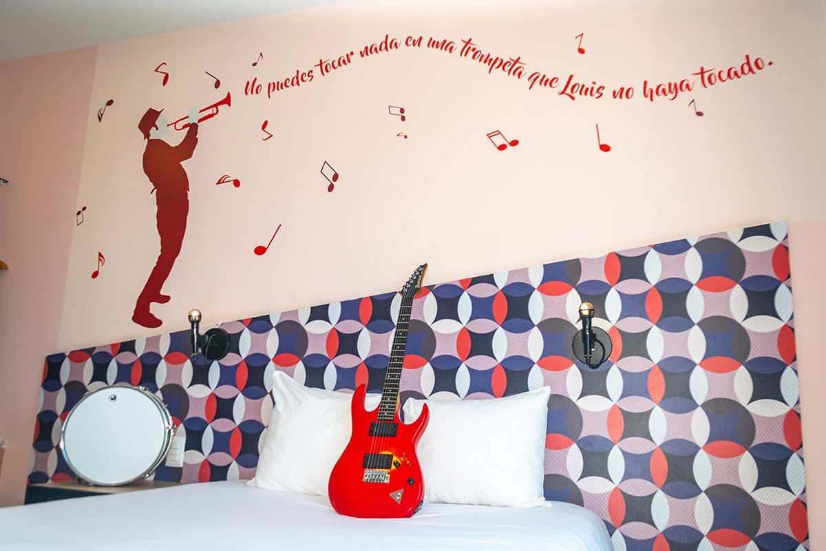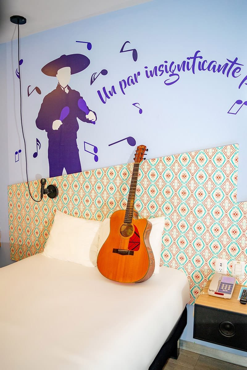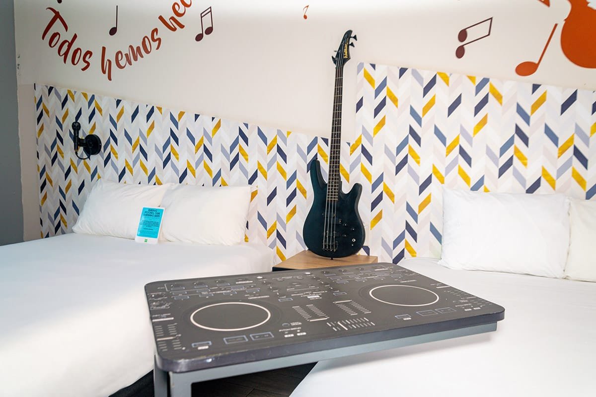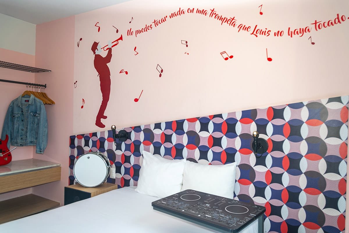 Este hotel se distingue por su decoración temática inspirada en la música, con un estilo moderno e industrial que transporta a los huéspedes a un ambiente vibrante y artístico. Cada piso del hotel está decorado con un género musical diferente: desde el ritmo tradicional del mariachi mexicano, pasando por los sonidos del jazz, la energía del rock o el ambiente festivo de los DJ’s. Todo el hotel es una experiencia visual única.