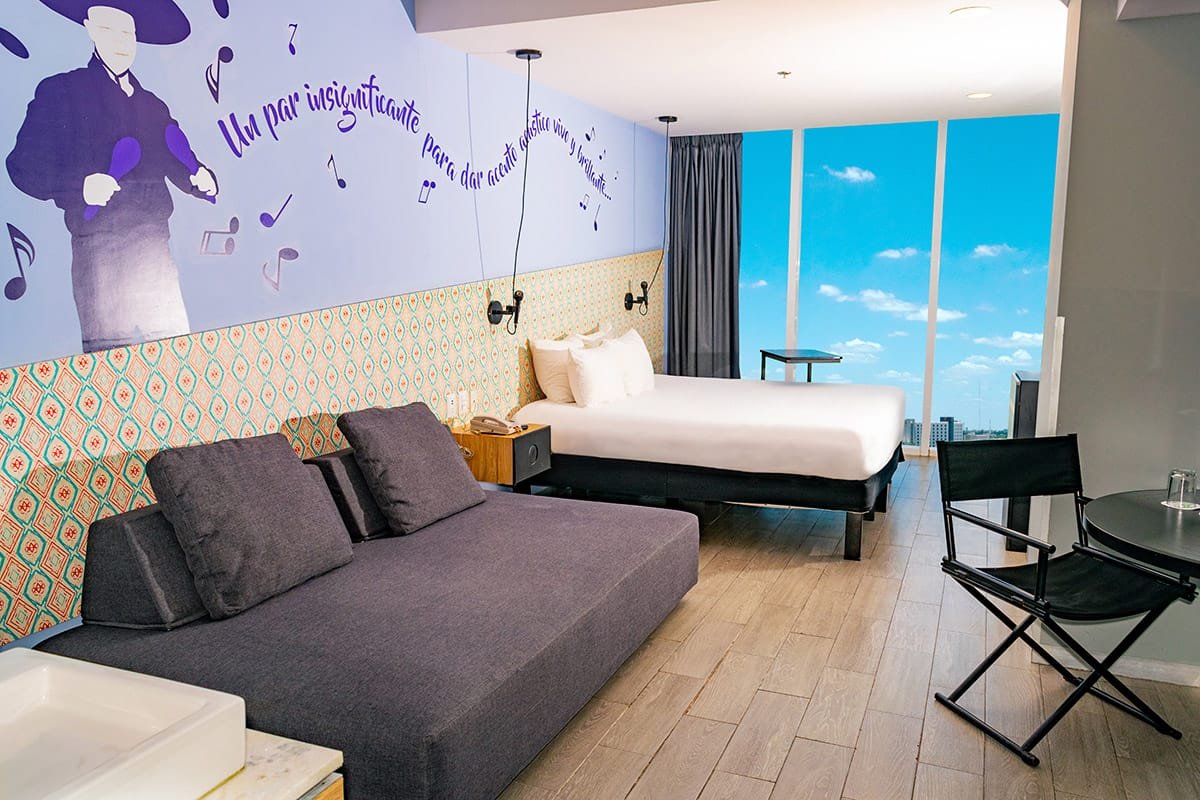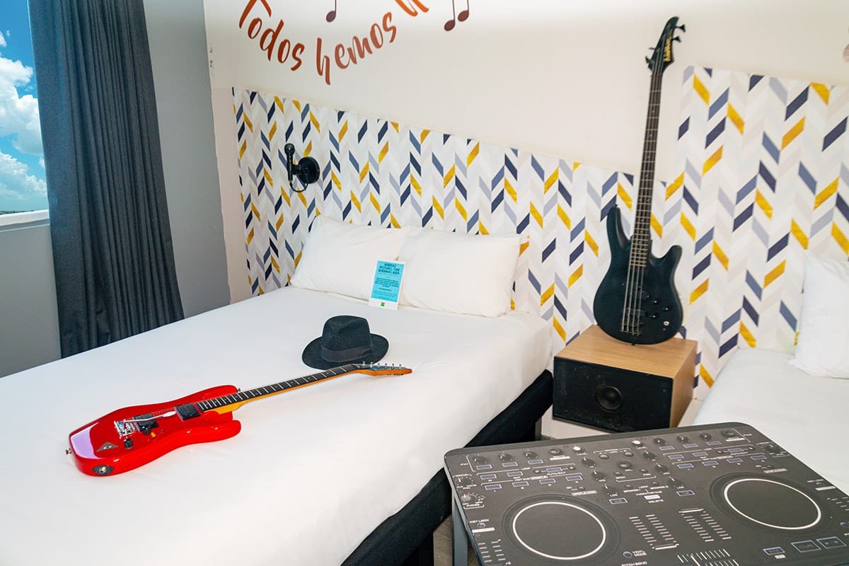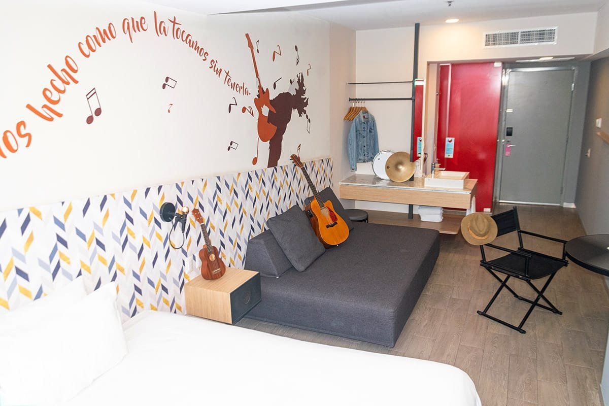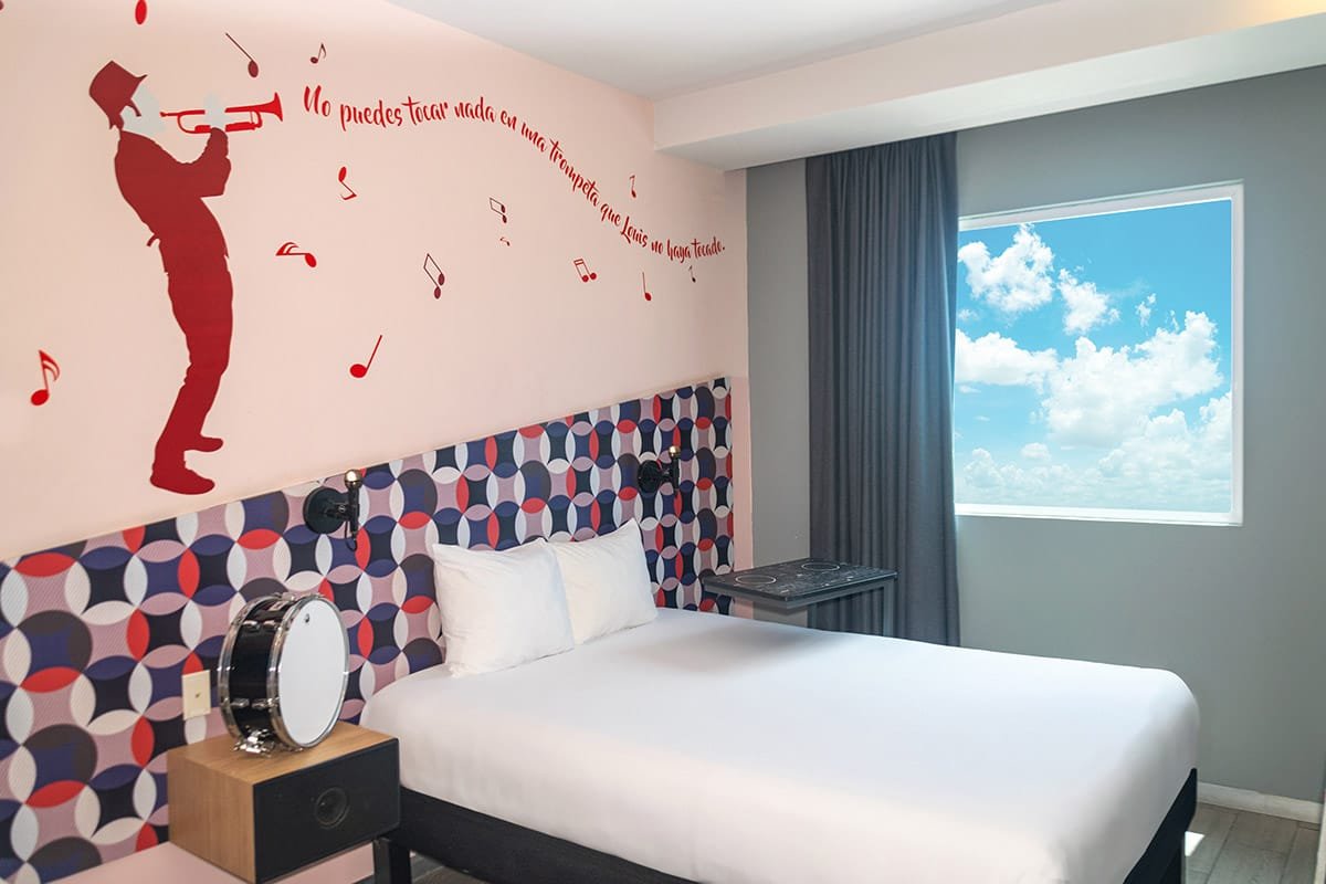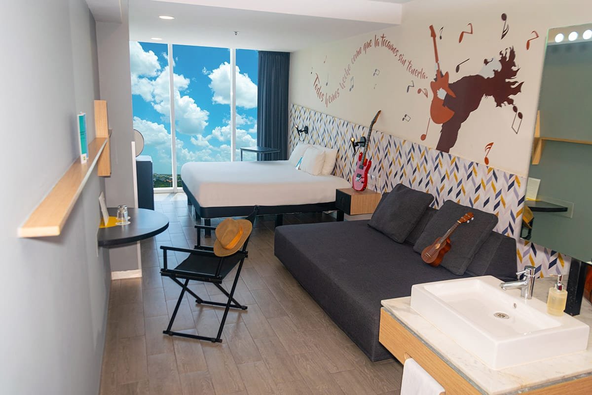 Este hotel se distingue por su decoración temática inspirada en la música, con un estilo moderno e industrial que transporta a los huéspedes a un ambiente vibrante y artístico. Cada piso del hotel está decorado con un género musical diferente: desde el ritmo tradicional del mariachi mexicano, pasando por los sonidos del jazz, la energía del rock o el ambiente festivo de los DJ’s. Todo el hotel es una experiencia visual única.