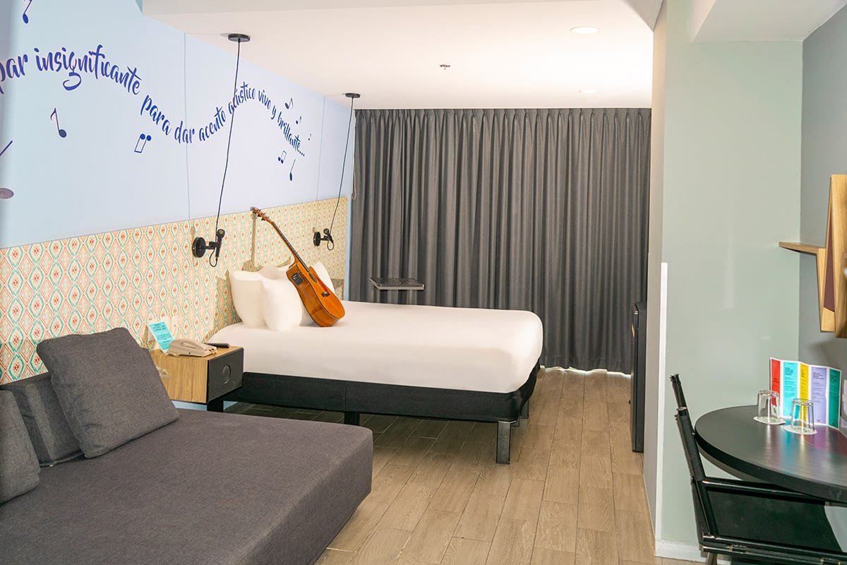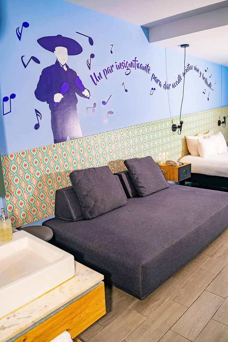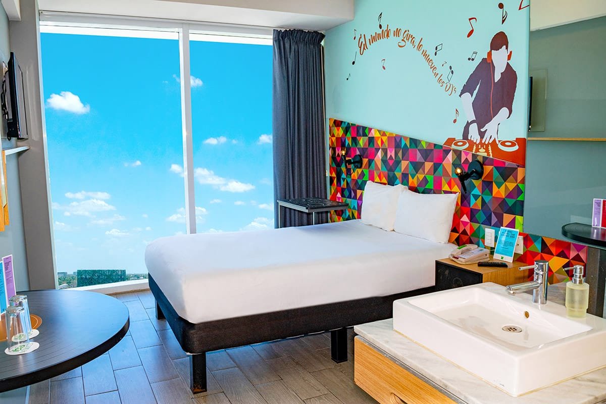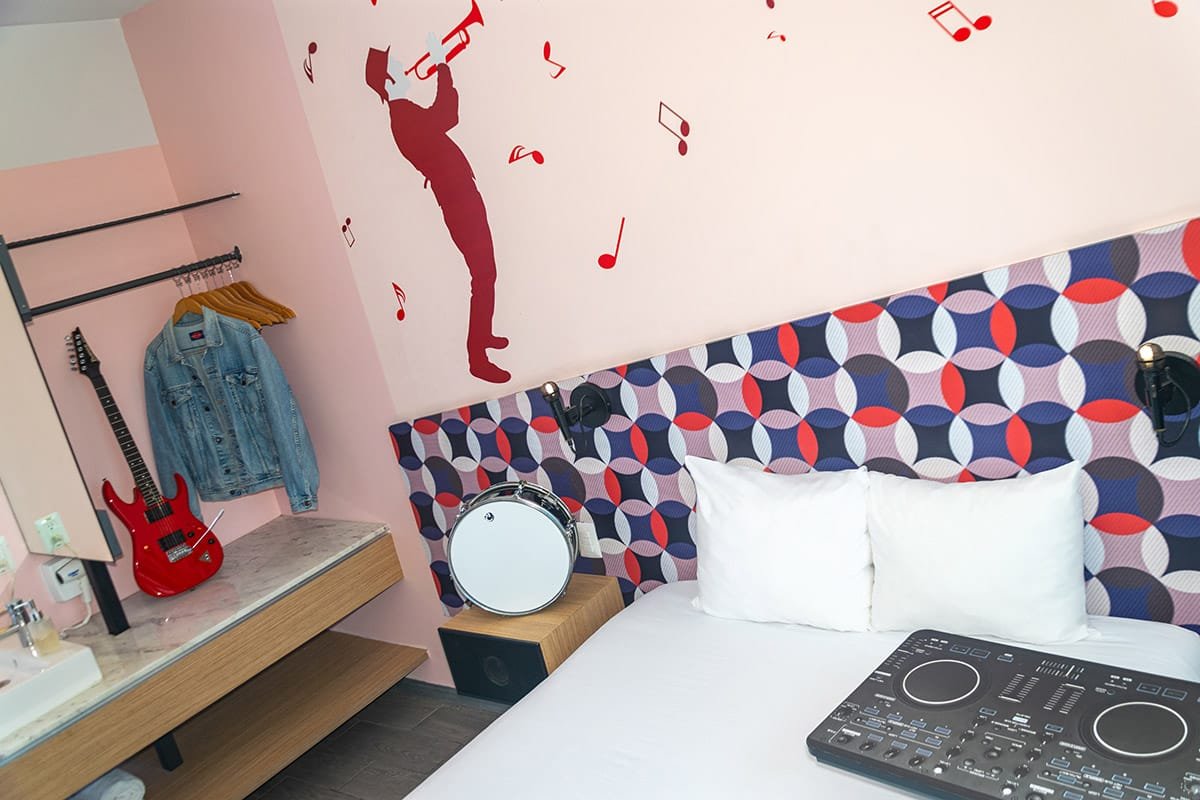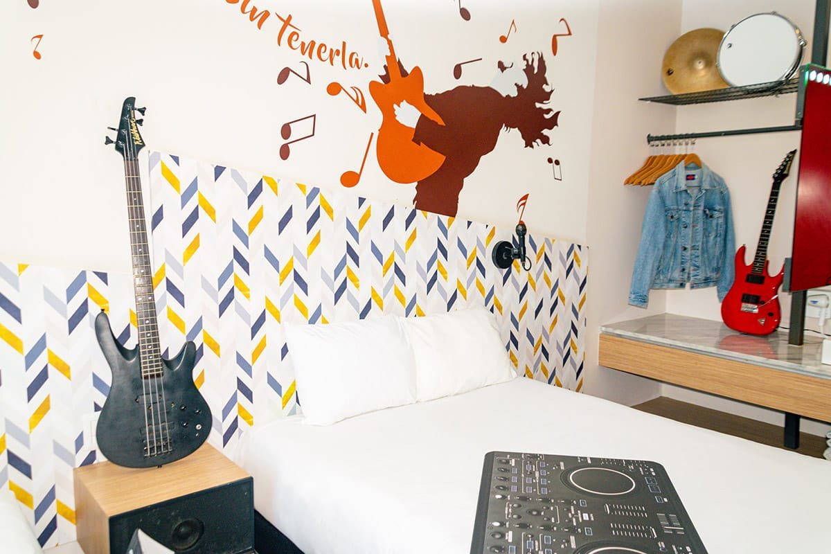 Este hotel se distingue por su decoración temática inspirada en la música, con un estilo moderno e industrial que transporta a los huéspedes a un ambiente vibrante y artístico. Cada piso del hotel está decorado con un género musical diferente: desde el ritmo tradicional del mariachi mexicano, pasando por los sonidos del jazz, la energía del rock o el ambiente festivo de los DJ’s. Todo el hotel es una experiencia visual única.