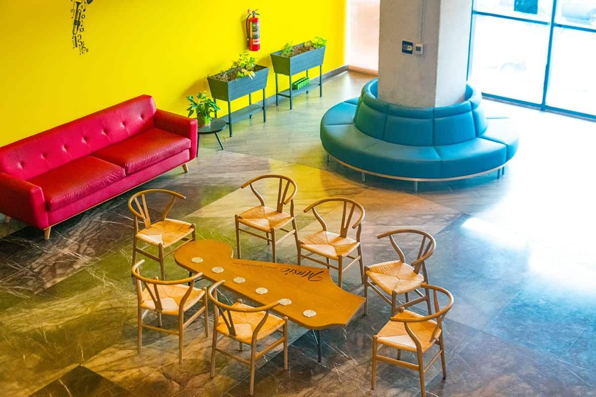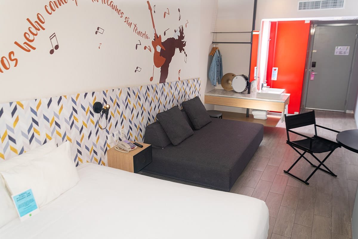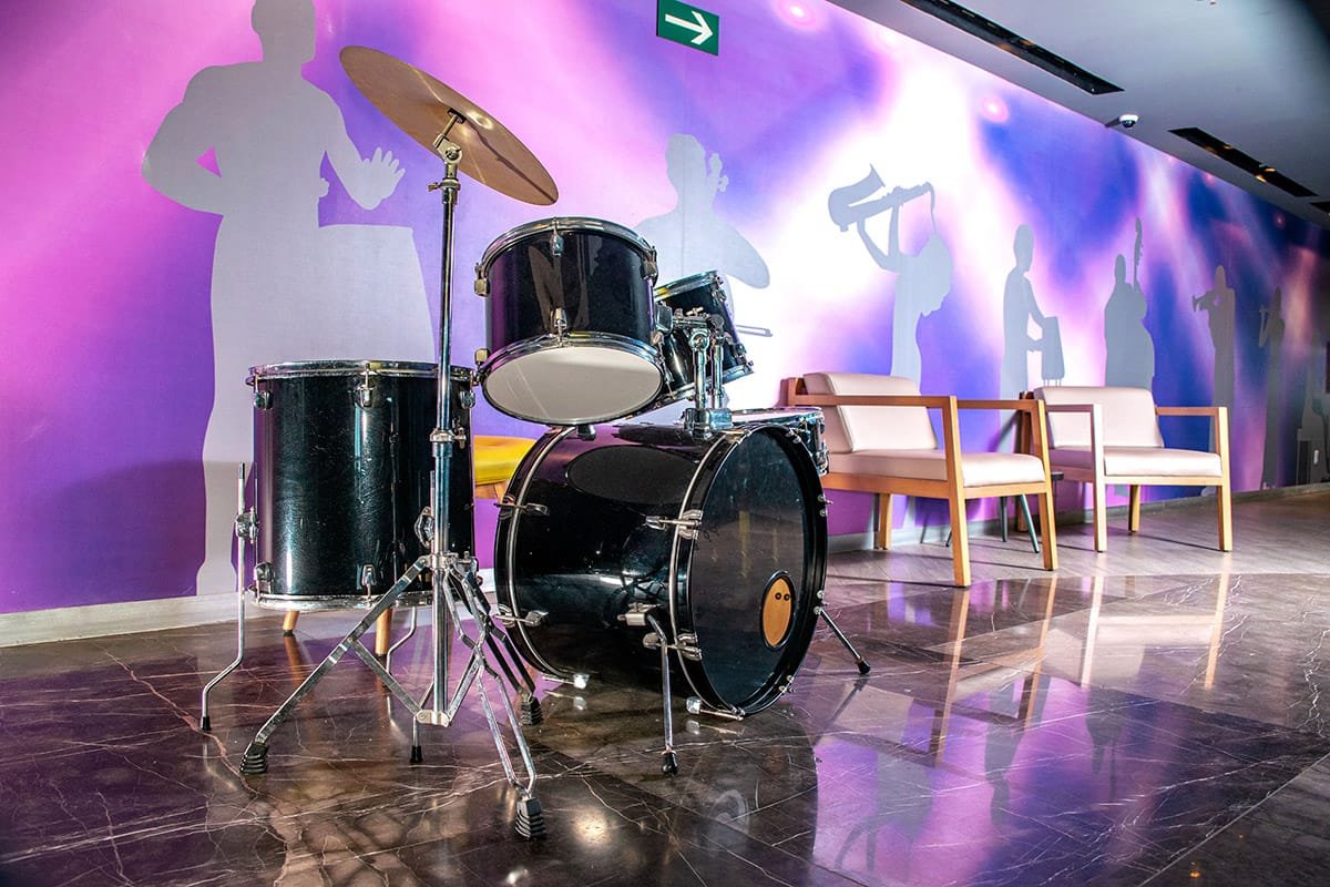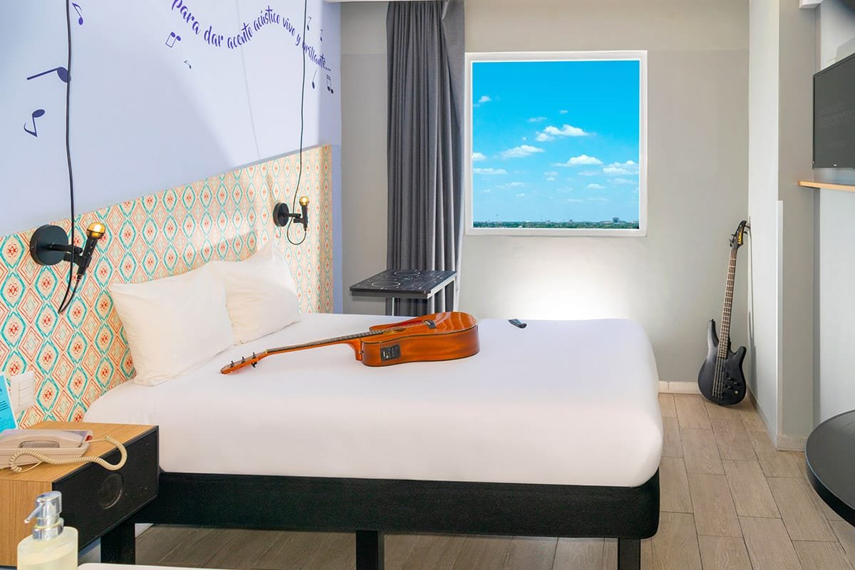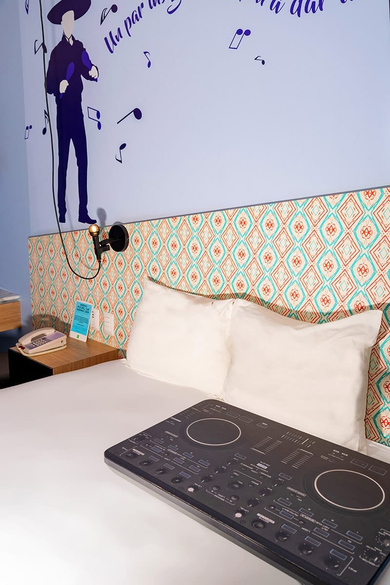 Este hotel se distingue por su decoración temática inspirada en la música, con un estilo moderno e industrial que transporta a los huéspedes a un ambiente vibrante y artístico. Cada piso del hotel está decorado con un género musical diferente: desde el ritmo tradicional del mariachi mexicano, pasando por los sonidos del jazz, la energía del rock o el ambiente festivo de los DJ’s. Todo el hotel es una experiencia visual única.